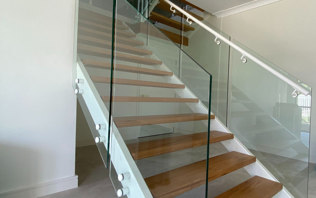 Custom newel posts, stringers, treads and 316 stainless bar balustrading