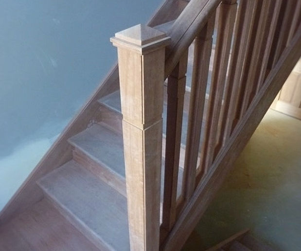 Custom newel posts, stringers, treads, risers and balustrade with colonial handrail